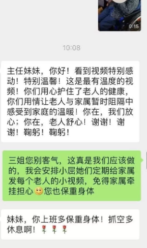 自老年公寓封閉后,公寓的工作人員便與老人家屬們進(jìn)行了一對一的電話溝通,通過微信,視頻等方式,向家屬們詳細(xì)介紹和展示了當(dāng)前公寓內(nèi)的各種防控措施,以及護(hù)理員照料老人的服務(wù)細(xì)節(jié),以打消家屬們的顧慮,慢慢的一些家屬從不配合到理解,最終變成了支持。