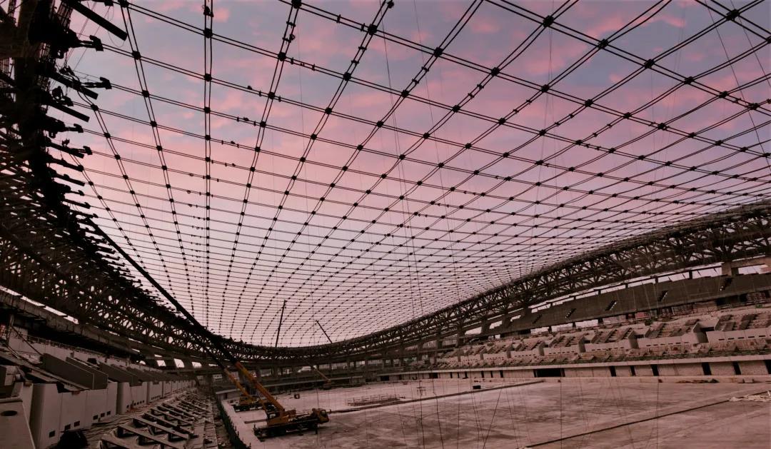 建設(shè)者通過49對(duì)承重索和30對(duì)穩(wěn)定索編織成長跨198米、短跨124米的索網(wǎng)狀屋面,再鋪設(shè)1080塊4×4米單元屋面板組裝而成。由于索網(wǎng)屋面的空間形態(tài)非常復(fù)雜,張拉以后每一個(gè)“方格”空間形態(tài)都不一樣,因此填充的每一塊單元體尺寸也不同,需要通過實(shí)測(cè)得到數(shù)據(jù)后再進(jìn)行加工定制。