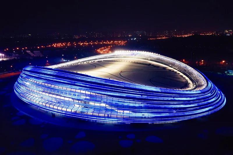 夜幕降臨,完工后的速滑館外立面燈光亮起,“冰絲帶”在北京奧林匹克森林公園“翩然起舞”。