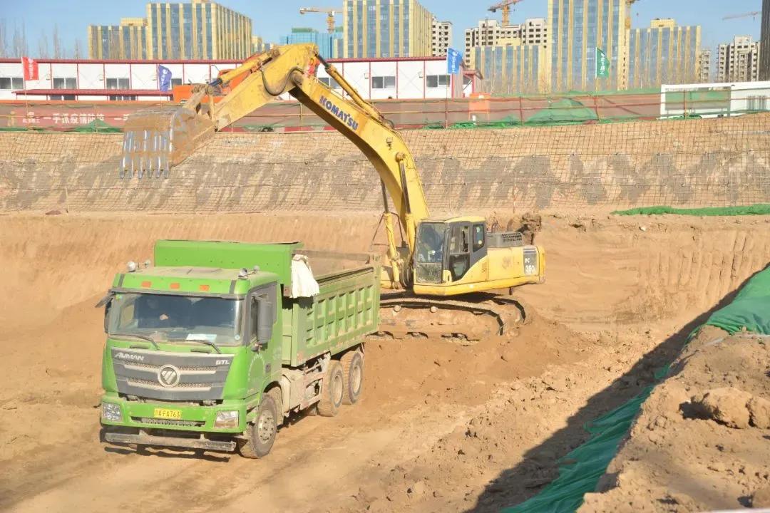 工程現(xiàn)場,多輛挖掘機及土方車投入作業(yè),佩戴著安全帽和口罩的工人們正熱火朝天地進行土方開挖工作。