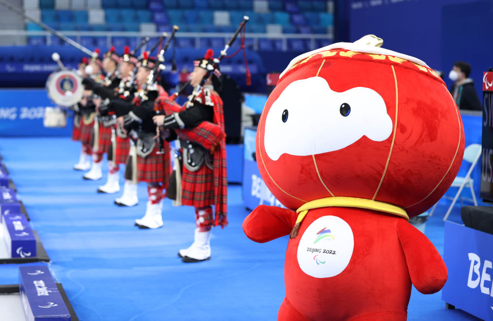 在國家游泳中心“冰立方”,“雪容融”在輪椅冰壺循環(huán)賽前參與表演。新華社記者杜瀟逸攝