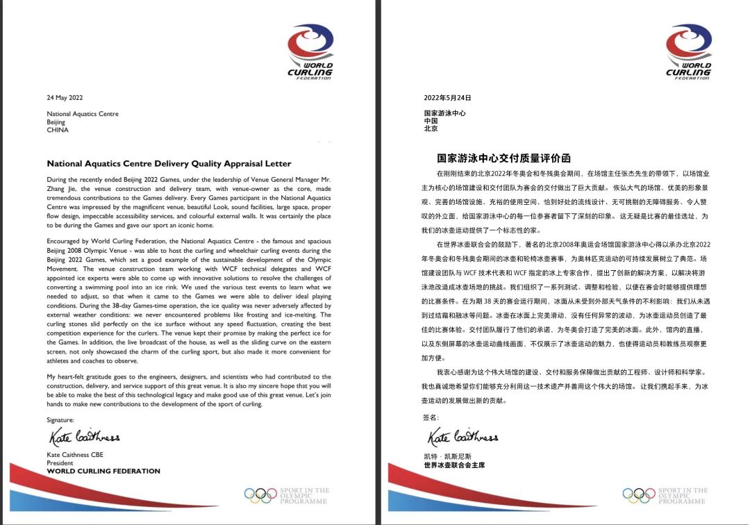 5月24日,國家游泳中心收到世界冰壺聯(lián)合會(huì)主席凱特•凱斯尼斯發(fā)來《國家游泳中心交付質(zhì)量評(píng)價(jià)函》,高度評(píng)價(jià)了國家游泳中心在冬奧會(huì)和冬殘奧會(huì)期間賽事交付質(zhì)量,肯定了場(chǎng)館為國際奧林匹克運(yùn)動(dòng)樹立的典范作用,并對(duì)所有為場(chǎng)館建設(shè)、交付和服務(wù)保障做出突出貢獻(xiàn)的冬奧人表示感謝。