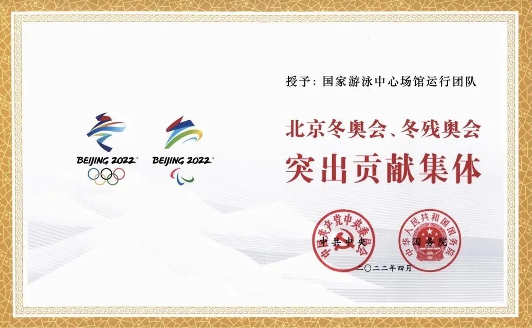 2022年4月8日的北京冬奧會(huì)冬殘奧會(huì)總結(jié)表彰大會(huì)上,黨中央、國務(wù)院授予國家游泳中心場(chǎng)館運(yùn)行團(tuán)隊(duì)“北京冬奧會(huì)、冬殘奧會(huì)突出貢獻(xiàn)集體”榮譽(yù)稱號(hào),這是所有參與“冰立方”設(shè)計(jì)、改造和賽事服務(wù)保障人員的最高榮耀。