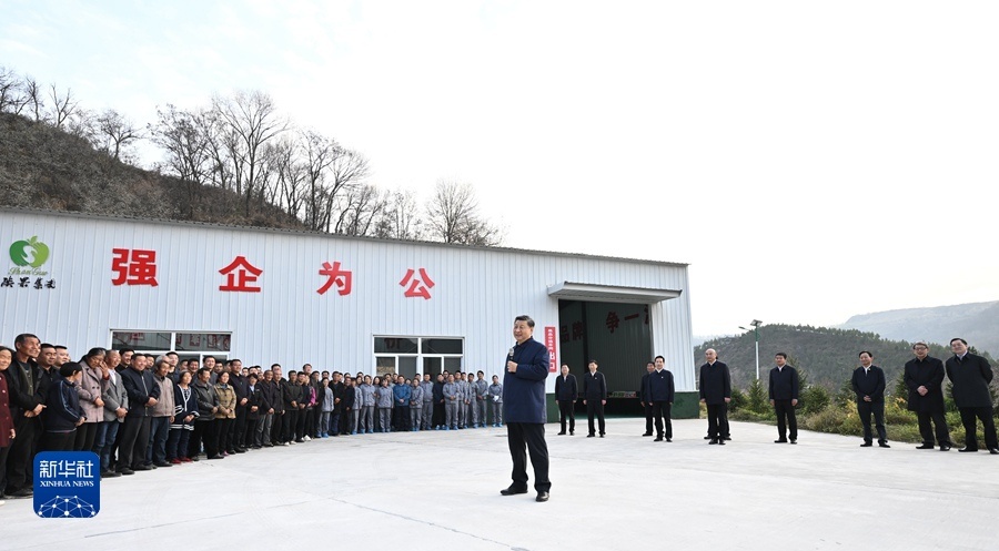 車間外,老鄉(xiāng)們聚集在一起,高聲向總書記問好。習近平同老鄉(xiāng)們拉起家常,回憶當年他在陜北的知青歲月。習近平對老鄉(xiāng)們說,我在陜北生活了7年,當年看到老鄉(xiāng)們生活很艱苦,心里就想著怎么樣讓大家生活好起來。這次來延安,看到一派碩果累累的豐收景象,交通條件大為改善,發(fā)生了翻天覆地的變化。過去陜北老鄉(xiāng)們修梯田、種莊稼,面朝黃土背朝天,掄起老鋤頭干活,廣種薄收,十分辛苦,如今山坡上退耕還林種上了蘋果,老鄉(xiāng)們有工作、有穩(wěn)定收入,孩子有好的教育,老人都有醫(yī)保,生活越來越好。從陜北的變化就可以看到中國的變化。習近平指出,現(xiàn)在,“兩個一百年”奮斗目標的第一個百年目標已經(jīng)實現(xiàn),絕對貧困問題解決了,老鄉(xiāng)們過上了好日子,但還要繼續(xù)努力往前走,讓生活越來越美好。陜北的氣候、光照、緯度、海拔等非常適宜發(fā)展蘋果種植,加上滴灌技術(shù)、矮化種植技術(shù)、選果生產(chǎn)線等不斷發(fā)展,就地賣出,銷路不愁,大力發(fā)展蘋果種植業(yè)可謂天時地利人和,這是最好的、最合適的產(chǎn)業(yè),大有前途。習近平強調(diào),中國共產(chǎn)黨是人民的黨,是為人民服務(wù)的黨,共產(chǎn)黨當家就是要為老百姓辦事,把老百姓的事情辦好??照?wù)`國,實干興邦。要認真學習貫徹黨的二十大精神,全面推進鄉(xiāng)村振興,把富民政策一項一項落實好,加快推進農(nóng)業(yè)農(nóng)村現(xiàn)代化,讓老鄉(xiāng)們生活越來越紅火。老鄉(xiāng)們爆發(fā)出雷鳴般的掌聲。