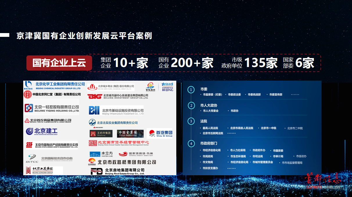 京津冀國有企業(yè)創(chuàng)新發(fā)展云平臺案例:首都信息作為市國資委支持的“京津冀國有企業(yè)創(chuàng)新發(fā)展云平臺”云服務(wù)商,積極為市屬國資國企提供安全可信云基礎(chǔ)設(shè)施及私有云解決方案,為企業(yè)提供在線管控(“三重一大”決策與運行監(jiān)管、大額資金動態(tài)管控等)、數(shù)字化運營(業(yè)財一體化平臺等)、協(xié)同服務(wù)(融媒體、營銷、移動平臺等)等數(shù)字化平臺解決方案,取得較好應(yīng)用效果。