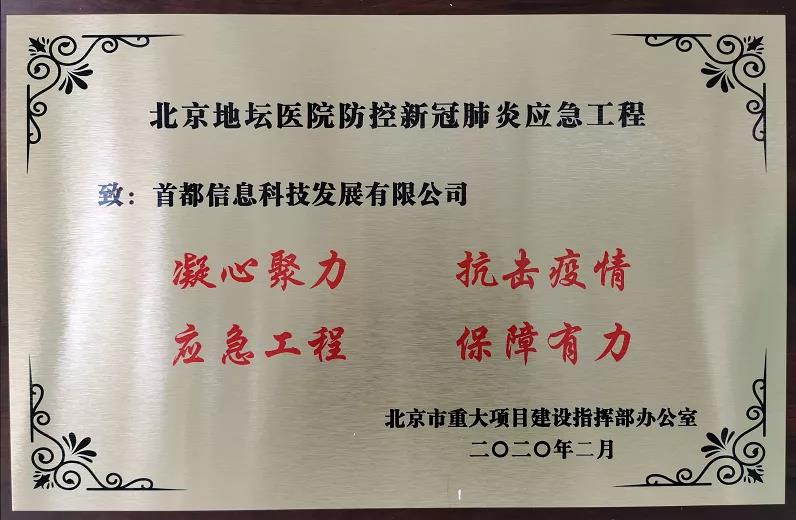 近日,市防控新冠肺炎應(yīng)急工程指揮部(市重大辦)向北京國(guó)資公司所屬首都信息公司頒發(fā)了一塊沉甸甸的獎(jiǎng)牌,以這十六個(gè)字的高度評(píng)價(jià),對(duì)所屬首信科技公司在北京地壇醫(yī)院防控新冠肺炎應(yīng)急工程中的出色表現(xiàn)給予表彰。