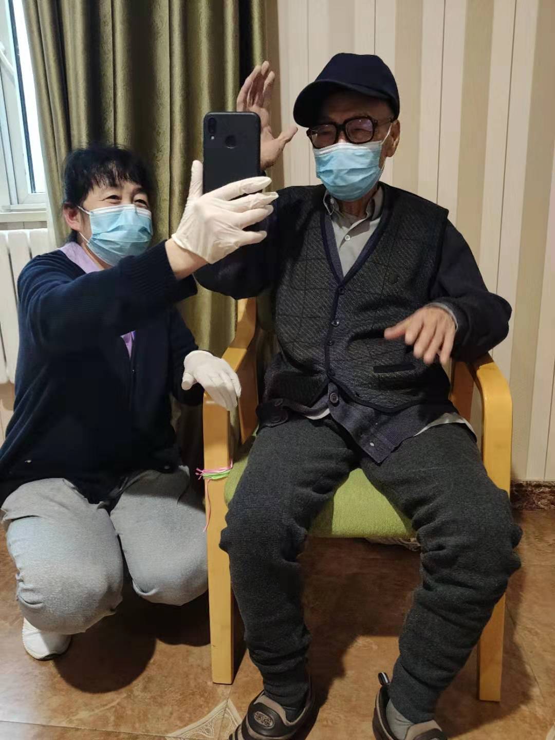 誠和敬長者公館老人在工作人員幫助下與家人視頻