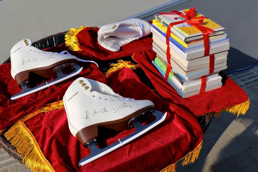 在“攜手未來 圓夢冰雪”公益活動啟動儀式上,北京國資公司副總裁兼北奧集團董事長肖文德、北京市婦聯(lián)社會工作部部長李雪松、北奧集團總經(jīng)理金延、國家游泳中心總經(jīng)理楊奇勇、國家體育場黨委副書記杜詩文、北京北發(fā)公司總經(jīng)理年小雷向來自低收入村的優(yōu)秀學(xué)生代表贈送葉喬波簽名冰鞋和王冰玉簽名冬奧書籍套裝。